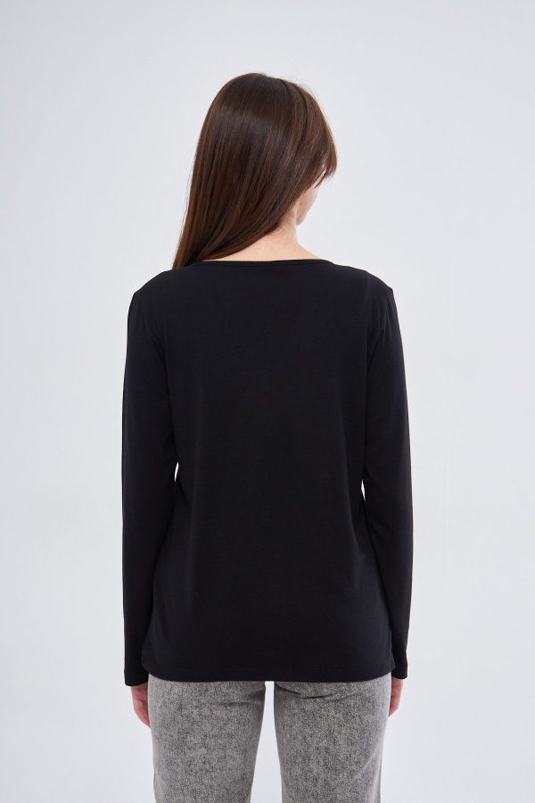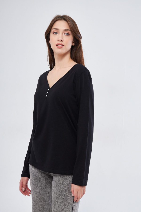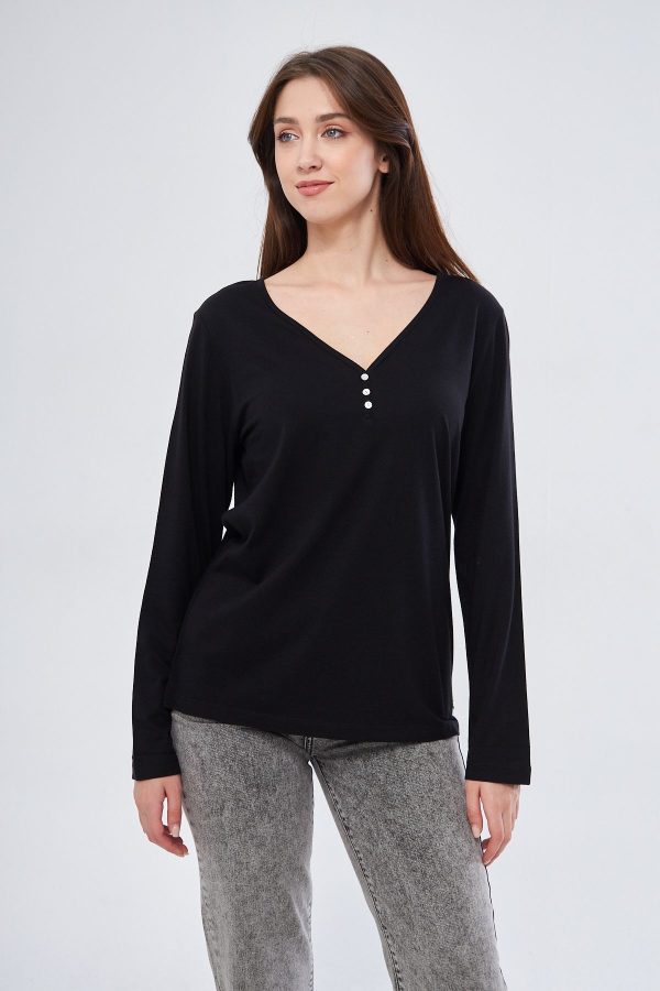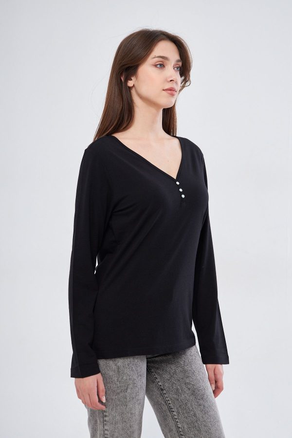 Uzun Kollu T-Shirt %100 Pamuk Düğmeli Yaka