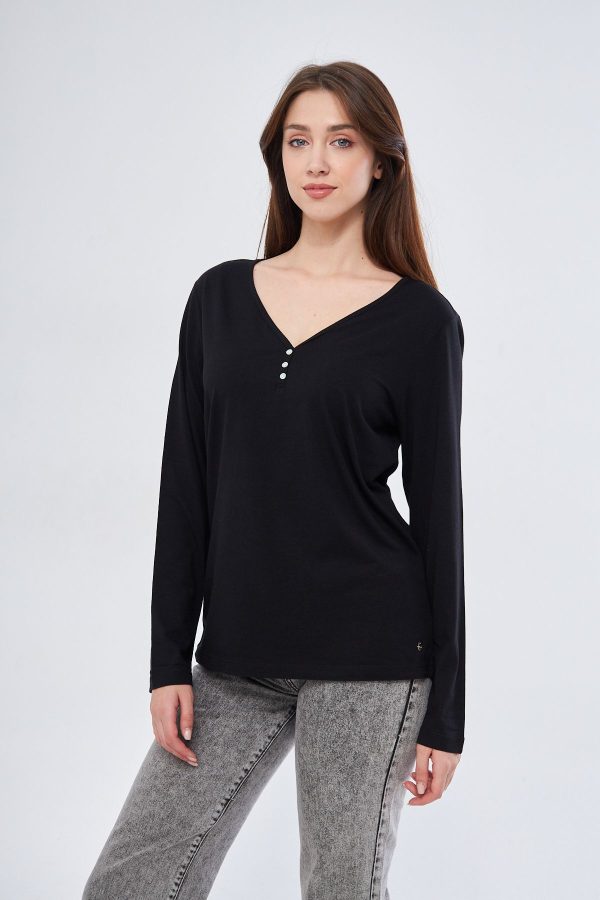 - Uzun Kollu T-Shirt %100 Pamuk Düğmeli Yaka